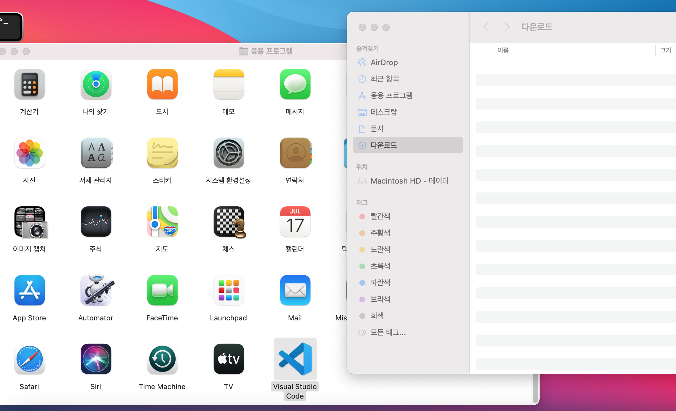 두개의 폴더를 열고, 다운로드에서 응용 프로그램으로 이동후 더블클릭하면 설치 됩니다.